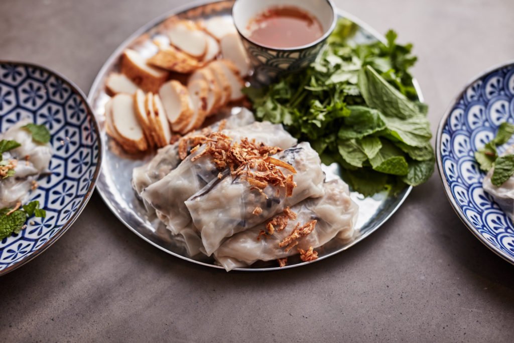 El bánh cuốn es una demostración de la delicadeza que puede alcanzar la cocina vietnamita. Estas láminas de arroz al vapor, tan finas como la seda, se rellenan con una mezcla perfumada de carne de cerdo picada, orejas de madera y hierbas aromáticas, creando un conjunto de sabores sutiles pero profundos. La preparación del bánh cuốn es todo un espectáculo: los chefs extienden la masa líquida de arroz sobre telas tensionadas sobre vapor, creando las láminas con movimientos precisos y elegantes. Se sirve tradicionalmente con chả lụa (embutido vietnamita), rodajas de pepino, hierbas frescas y una salsa de pescado aromatizada que realza su sabor suave. Este plato, especialmente popular en el norte de Vietnam, ofrece una experiencia gastronómica que privilegia la elegancia sobre la intensidad.