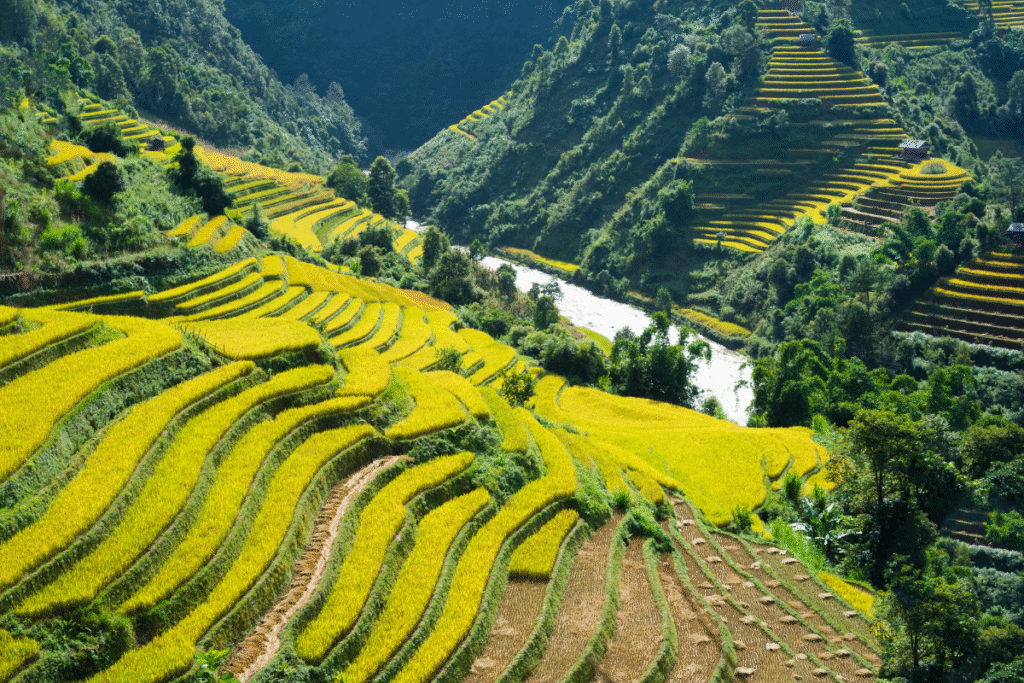 El paisaje se transforma en un mosaico dorado cuando las terrazas de arroz alcanzan su punto de cosecha. El clima seco y las temperaturas agradables crean condiciones perfectas para caminatas prolongadas, mientras la luz suave del atardecer acentúa la belleza serena de los valles y montañas.